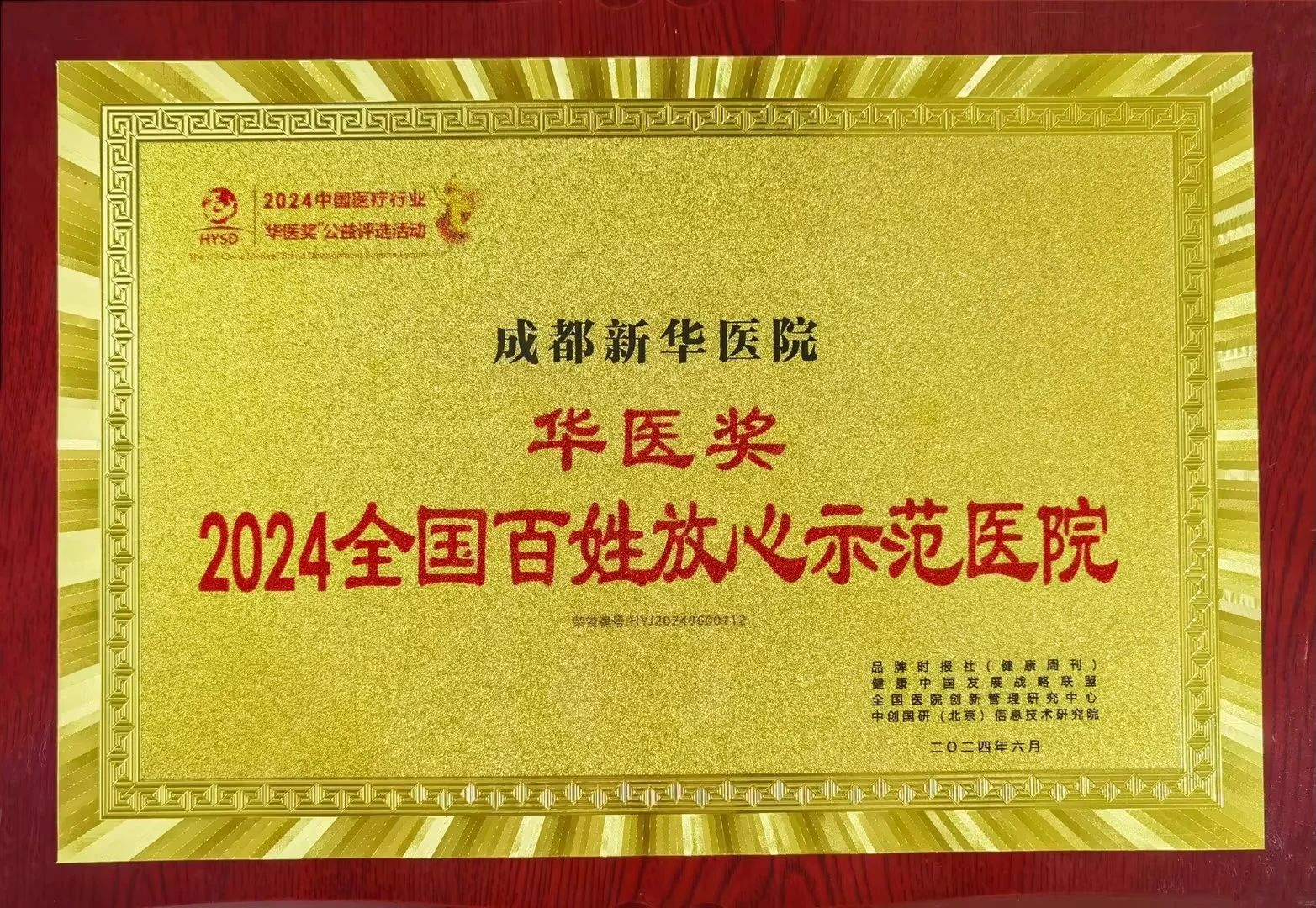 2024年7月,从2024中国“华医奖”评选活动传来喜讯,成都新华医院凭借卓越的医疗实力、精湛的医疗技术和优质的服务,荣获了“2024全国百姓放心示范医院”的荣誉称号,为医院的发展再添辉煌一笔!